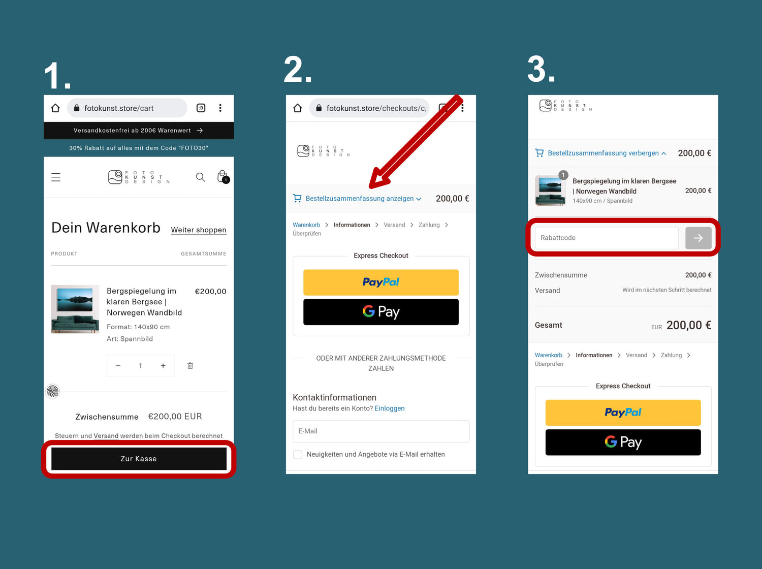 3. Auf "Bestellzusammenfassung anzeigen" klicken und in der Fläche "Rabattcode" den Rabattcode eingeben und mit dem Klick auf den Pfeil bestätigen.